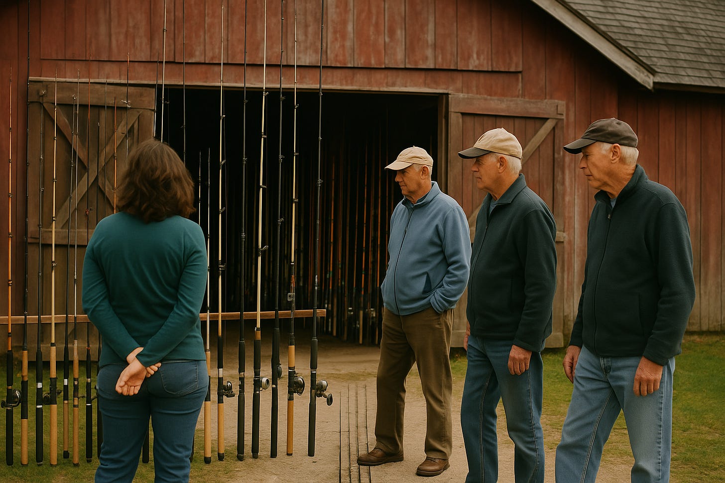 We pull into the driveway of this quintessential New England property — a classic shingle-style home, a barn, and another outbuilding. Wow. There must be over 50 fishing poles neatly lined in the barn up for sale, and another 20 behind caution tape marked “Not for sale.” On the other side of the barn is the wife’s set up — trays and trinkets. Nothing of interest to us.